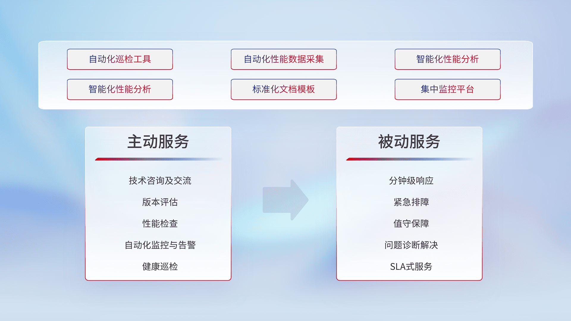 智能化工具和标准化文档,,保障服务质量,,,提供主动服务(包含技术咨询、、版本评估、、性能检查、、自动化监控与告警、、、健康巡检)和被动服务包含(分钟级响应、、紧急排障、、、、值守保障、、问题诊断解决、、SLA服务)。。。。